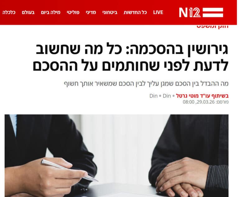 גירושין בהסכמה: כל מה שחשוב לדעת לפני שחותמים על ההסכם מאמר מאת עורך דין מוטי גרטל | כתבה שפורסמה ב n12 בתאריך: 29.03.2026